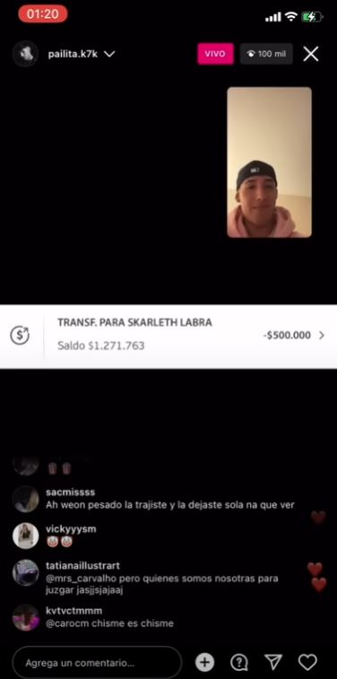 El cantante, en el live, publicó diversos pantallazos de conversaciones con ella y otros que evidenciaban que le había depositado dos sumas de $500.000 pesos.