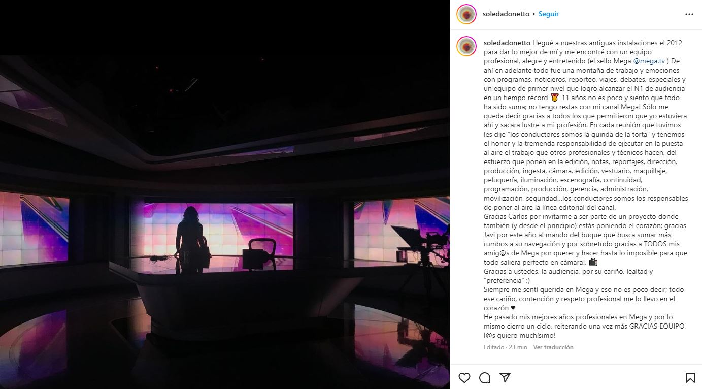Por último, expuso que "he pasado mis mejores años profesionales en Mega y por lo mismo cierro un ciclo, reiterando una vez más GRACIAS EQUIPO, los quiero muchísimo!".