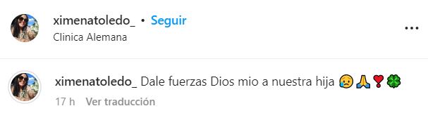 Ximena Toledo subió una imagen en su cuenta de Instagram en donde publicó una oración para un enfermo. En la descripción escribió: "Dale fuerzas, Dios mío, a nuestra hija".