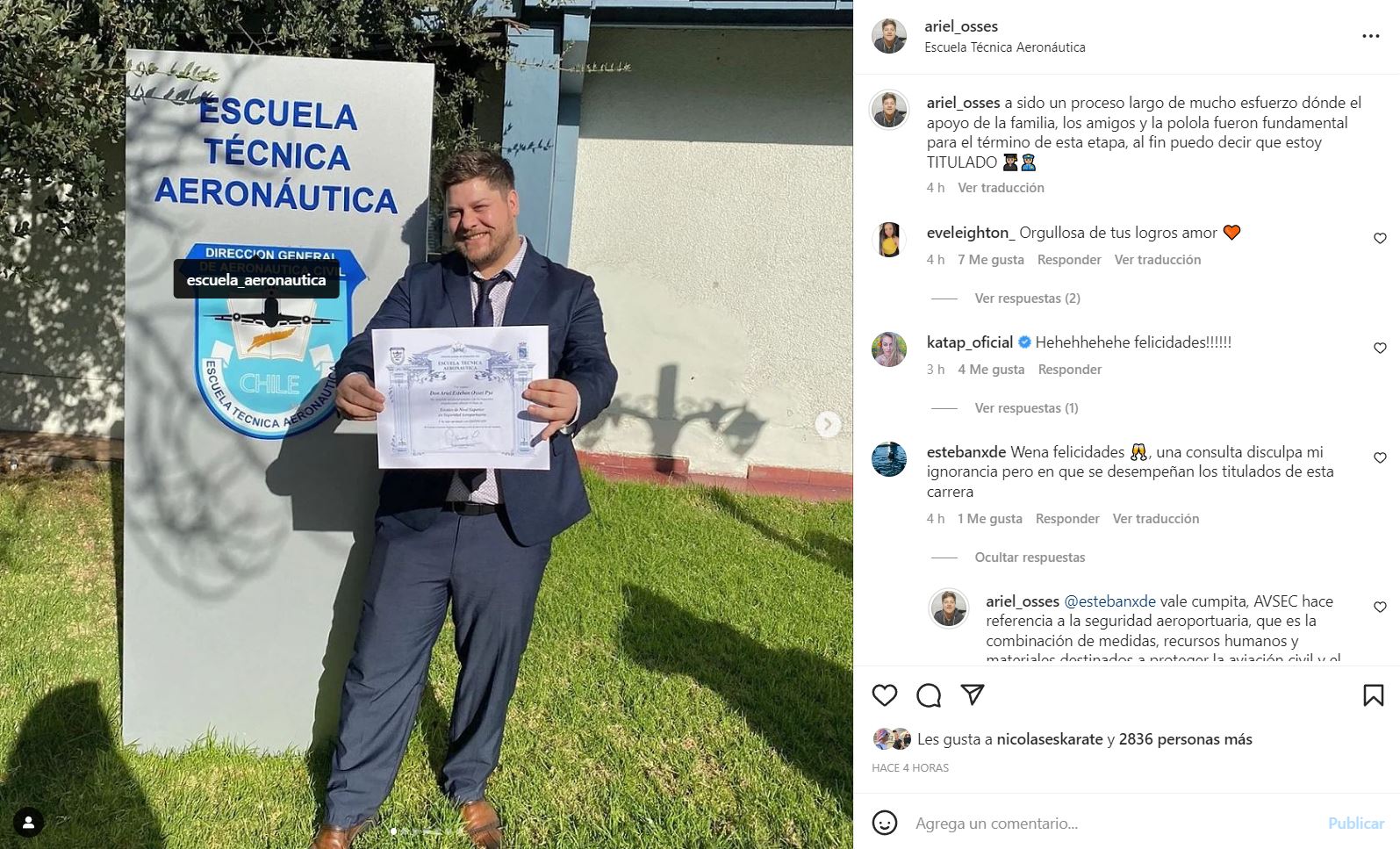 "Ha sido un proceso largo de mucho esfuerzo, donde el apoyo de la familia, los amigos y la polola fueron fundamental para el término de esta etapa, al fin puedo decir que estoy TITULADO", escribió en la descripción del posteo.