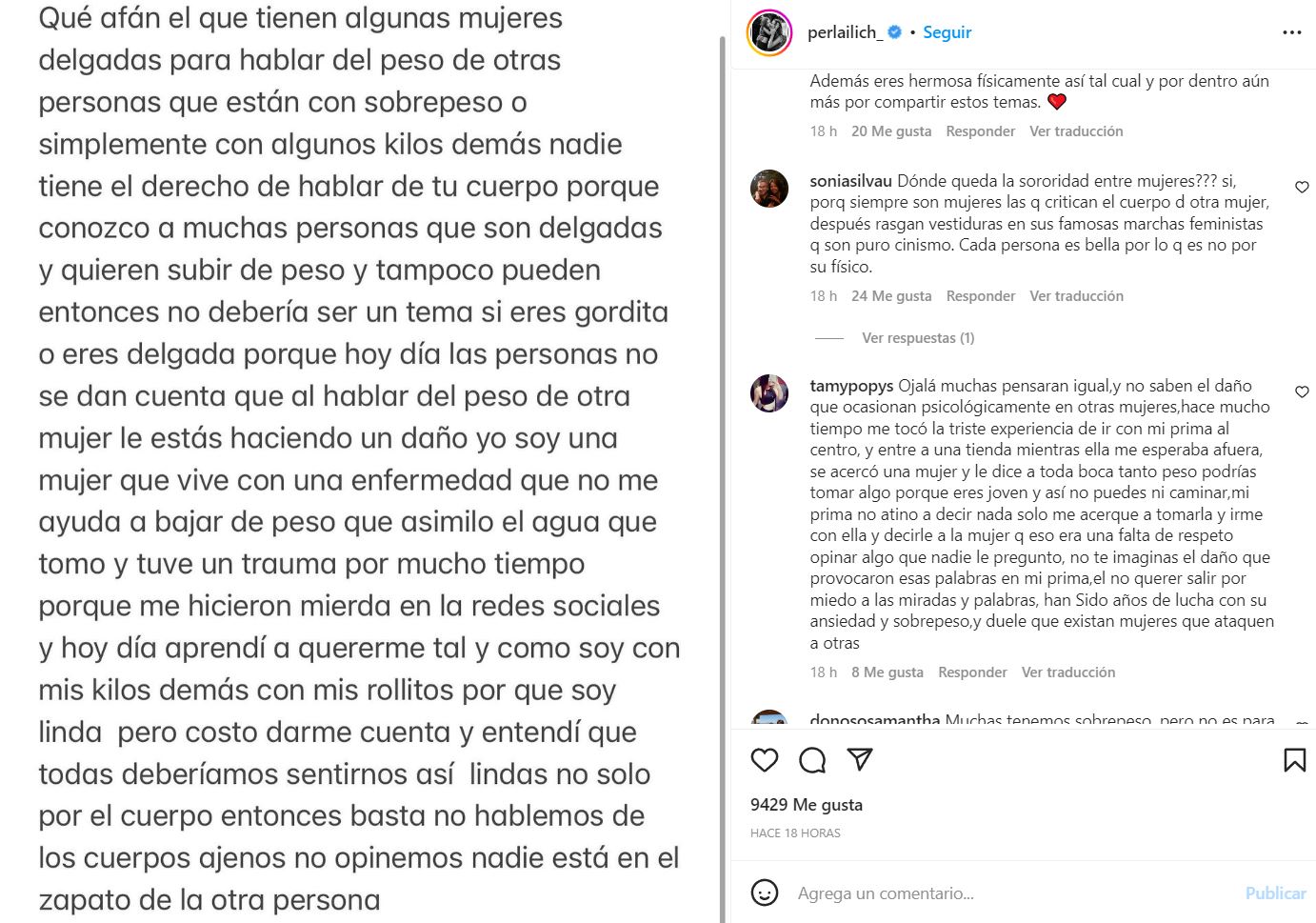 "Tantas personas avergonzadas por su cuerpo y no veo a nadie acomplejada por sus mentes, allí sí es el problema", "Nooo, me hiciste caer lagrimitas .. qué razón tienes!" y "ojalá muchas pensaran igual, y no saben el daño que ocasionan psicológicamente en otras mujeres", fueron algunos de los comentarios que recibió.