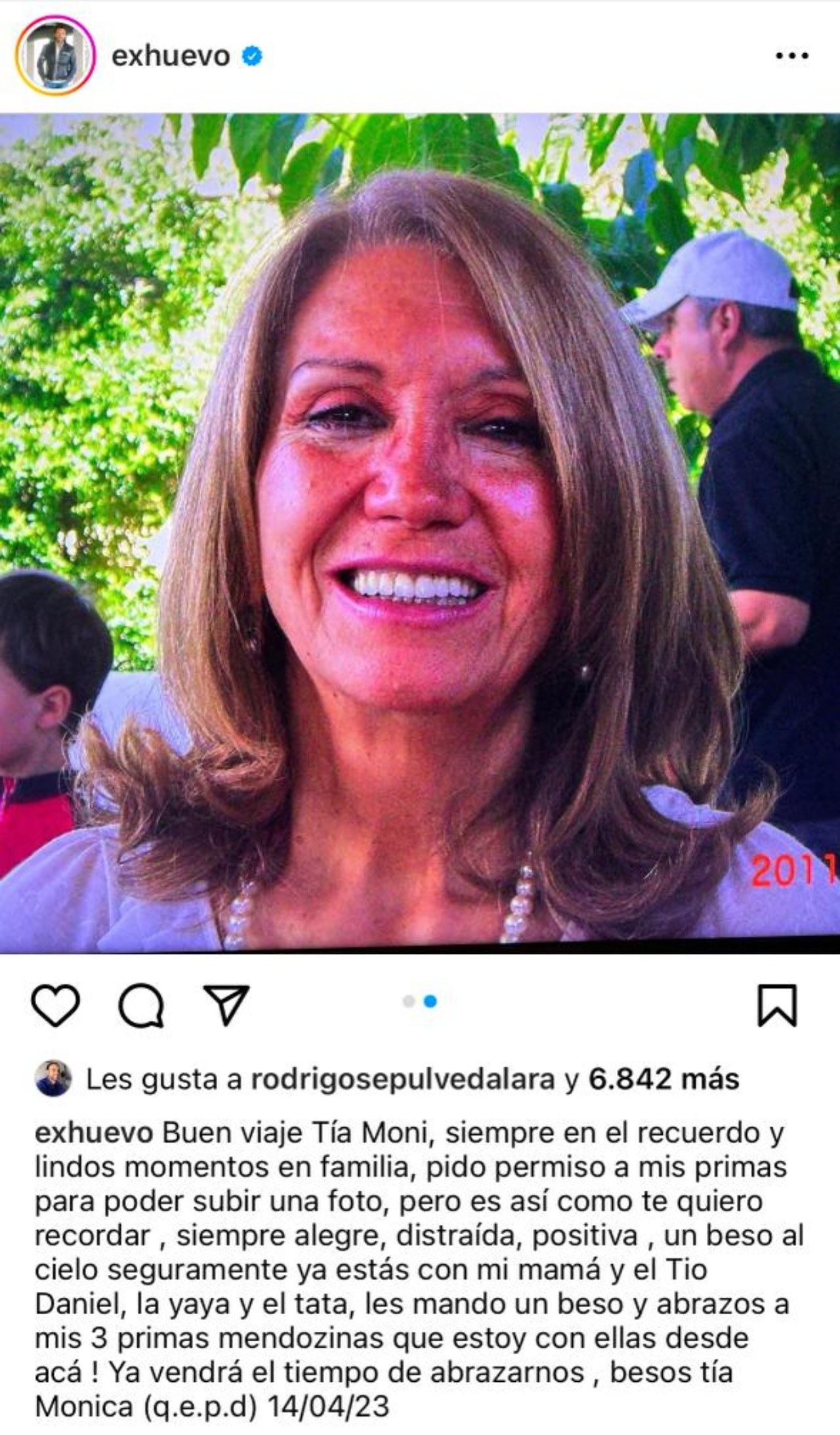 En su cuenta de instagram, Fuenzalida reveló el fallecimiento de su tía Mónica. "Buen viaje, tía Moni", partió escribiendo el conductor en su publicación, junto con una imagen de una cinta de luto.