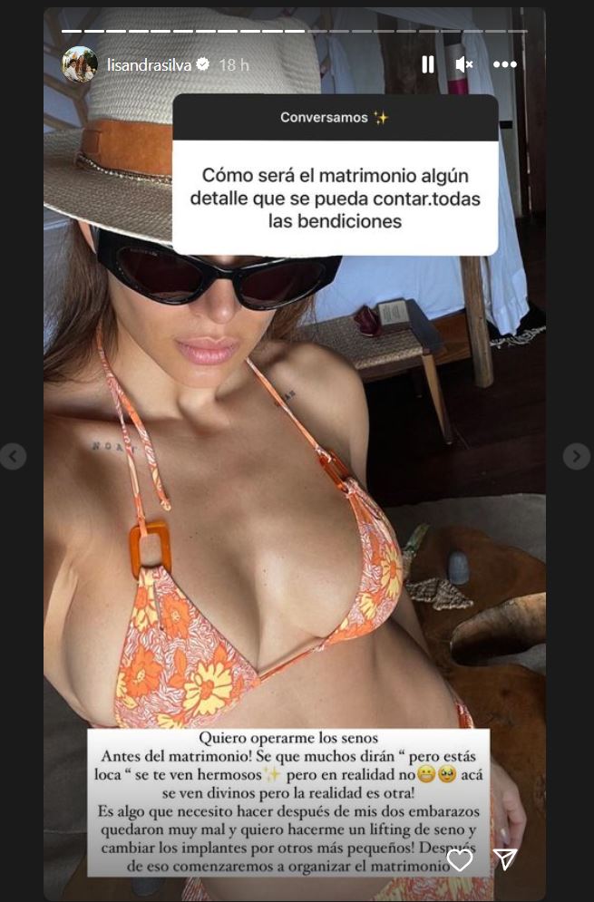 "Quiero operarme los senos antes del matrimonio! Sé que muchos dirán 'pero estás loca, se te ven hermosos', pero en realidad no. Acá se ven divinos, pero la realidad es otra", indicó.