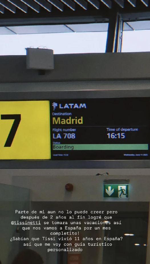 A través de sus historias de Instagram, Kel mostró una imagen en la que aparece la pantalla de su puerta de embarque, revelando que el destino que tomaron ambos fue Madrid, España, ciudad que tiene un estrecho vínculo con Tissinetti.