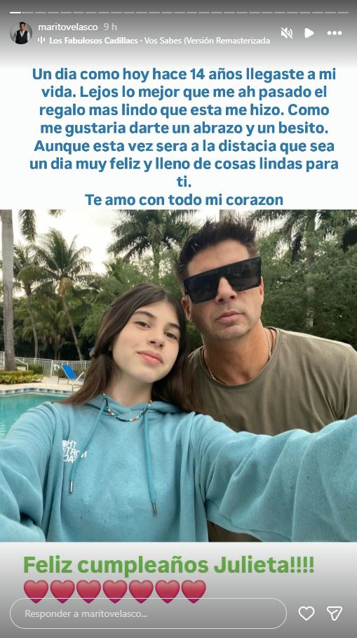 Mario Velasco enterneció a las redes sociales al dedicarle un especial y afectuoso saludo a Julieta, su hija, quien cumple 14 años este domingo 13 de julio. Cabe recordar que la menor es el fruto de su relación con Carolina Mestrovic.