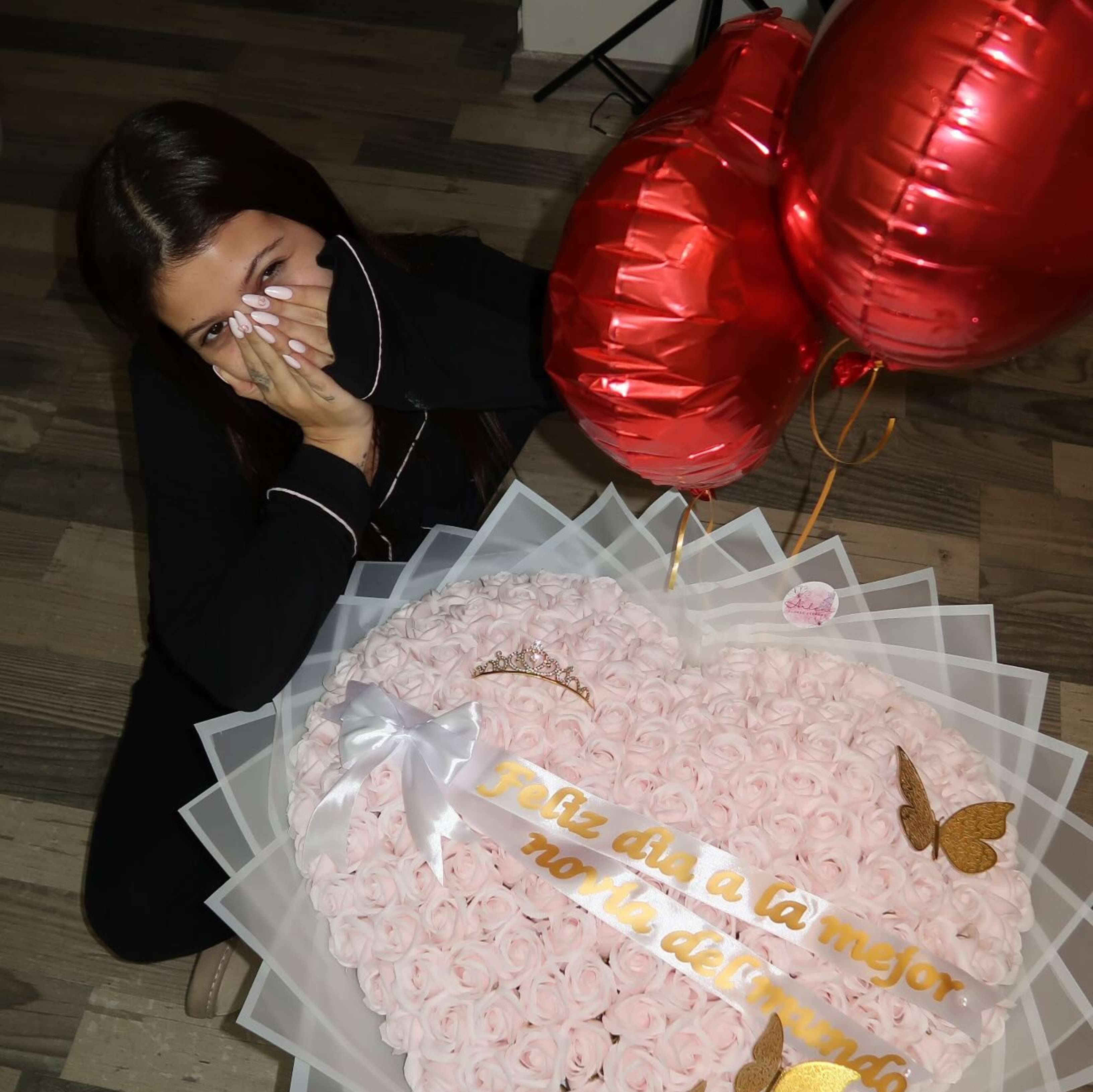 En esta oportunidad, el intérprete de "Me arrepentí" optó por un arreglo en forma de corazón formado por rosas en tono rosa pastel, decorado con lazos, mariposas doradas y globos rojos. En el centro se lee la frase: "Feliz día a la mejor novia del mundo".
