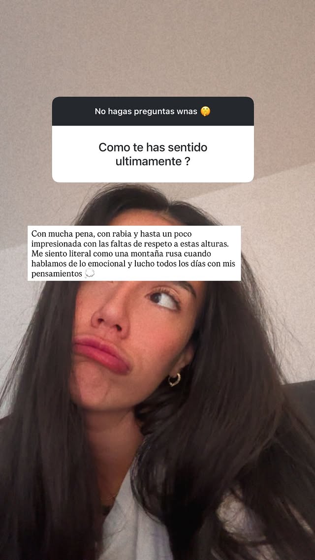 "Con mucha pena, con rabia y hasta un poco impresionada con las faltas de respeto a estas alturas. Me siento literal como una montaña rusa cuando hablamos de lo emocional y lucho todos los días con mis pensamientos", acotó.