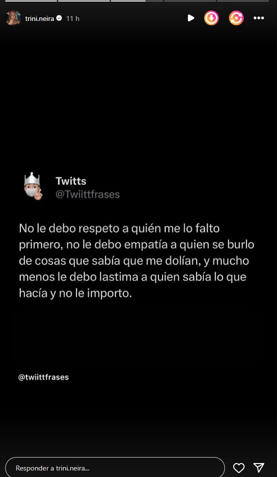 El mensaje, escrito por la cuenta @twiittfrases, dice "no le debo respeto a quien me lo faltó primero. No le debo empatía a quien se burló de cosas que sabía que me dolían y mucho menos le debo lástima a quien sabía lo que hacía y no le importo".
