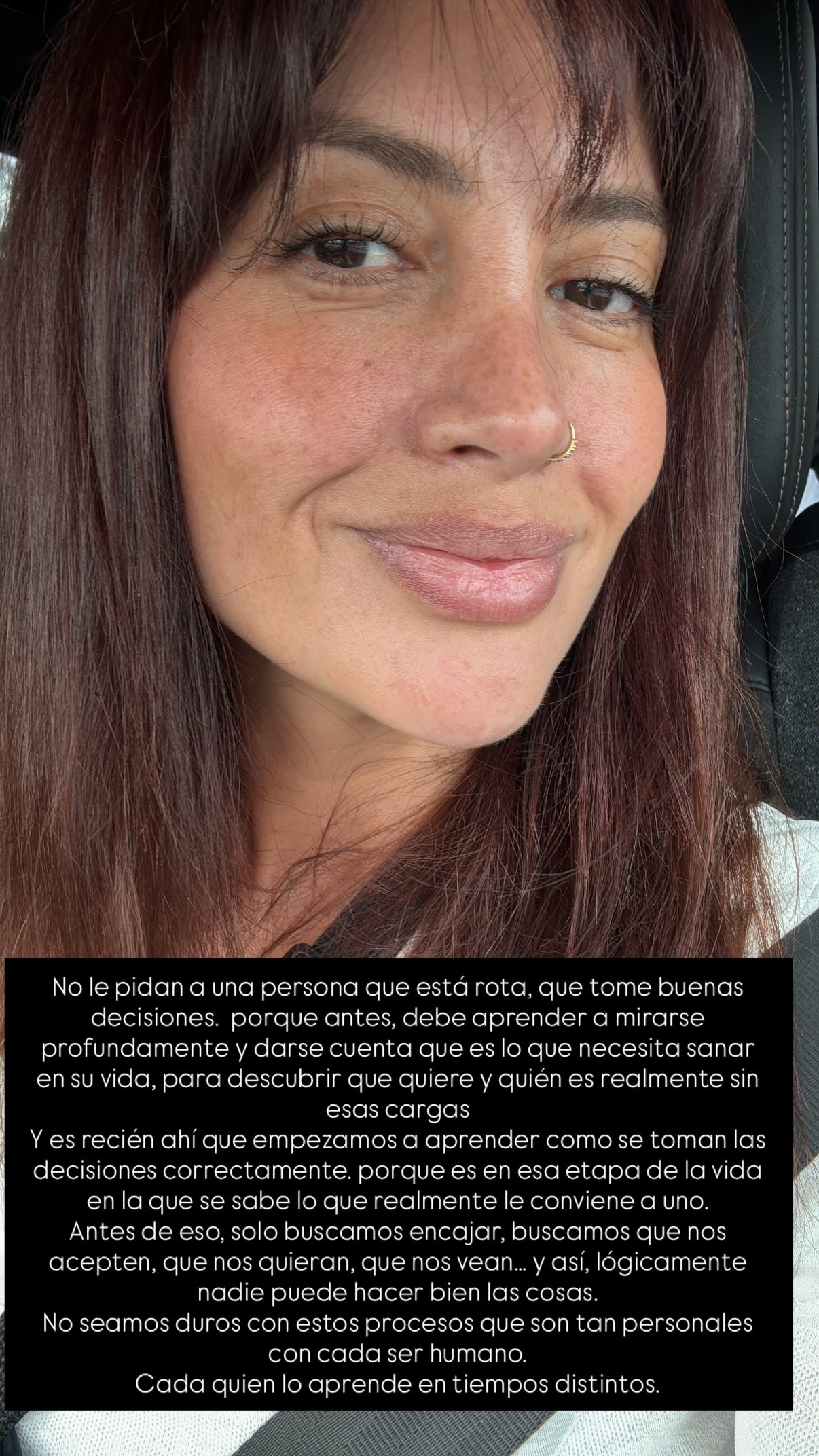 A través de sus historias de Instagram, Karen Paola manifestó: "No le pidan a una persona que está rota que tome buenas decisiones, porque antes debe aprender a mirarse profundamente y dar cuenta que es lo que necesita para sanar en su vida, para descubrir que quiere y quién es realmente sin cargas".
