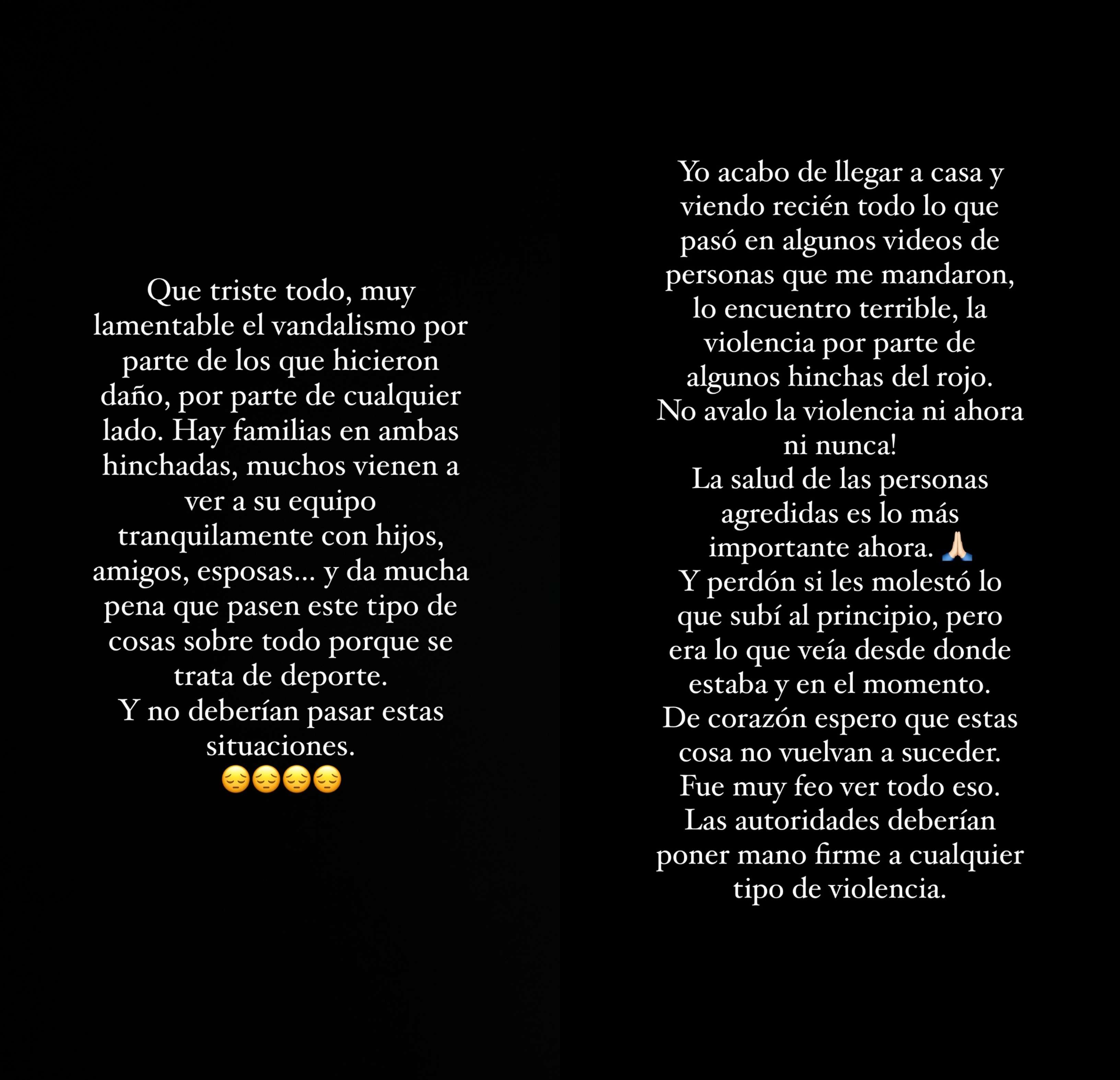 "Que triste todo, lamentable el vandalismo por parte de los que hicieron daño, por parte de cualquier lado. Hay familias en ambas hinchadas, muchos vienen a ver a su equipo tranquilamente con hijos, amigos esposas, y da mucha pena que pasen este tipo de cosas", escribió en otro post.