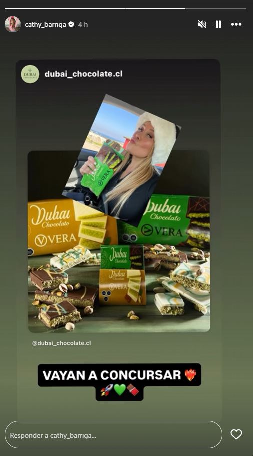 "La felicidad se encuentra en distintos momentos. Uno de ellos, para mí, es el chocolate. Te invito a disfrutar de esta explosión de sabor y colores... Dubai Chocolate", se le escucha decir a la exedil en el registro, que fue compartido por la página y posteriormente reposteado por ella.