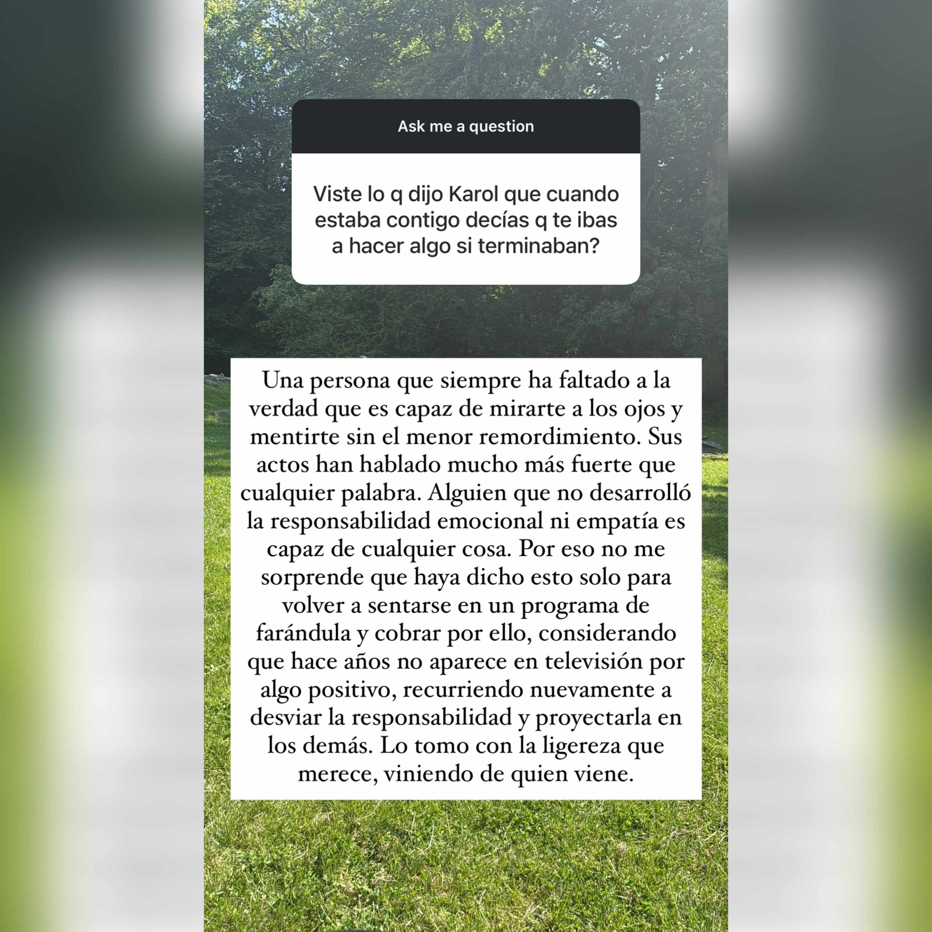 Durante una dinámica de preguntas y respuestas, un usuario preguntó a Arenita si estaba al tanto de los comentarios de Karol, quien aseguró que, cuando estaban juntos, ella le decía que se haría daño si terminaban la relación.