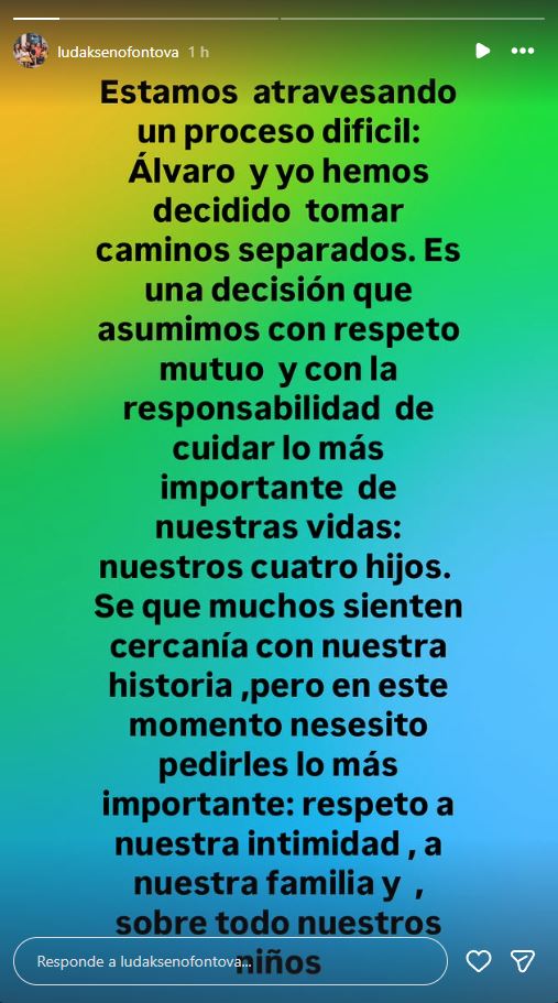 La también bailarina utilizó su cuenta de Instagram para abordar la separación: "Estamos atravesando un proceso difícil: Álvaro y yo hemos decidido tomar caminos separados. Es una decisión que asumimos con respeto mutuo y con la responsabilidad de cuidar lo más importante de nuestras vidas: nuestros cuatro hijos".