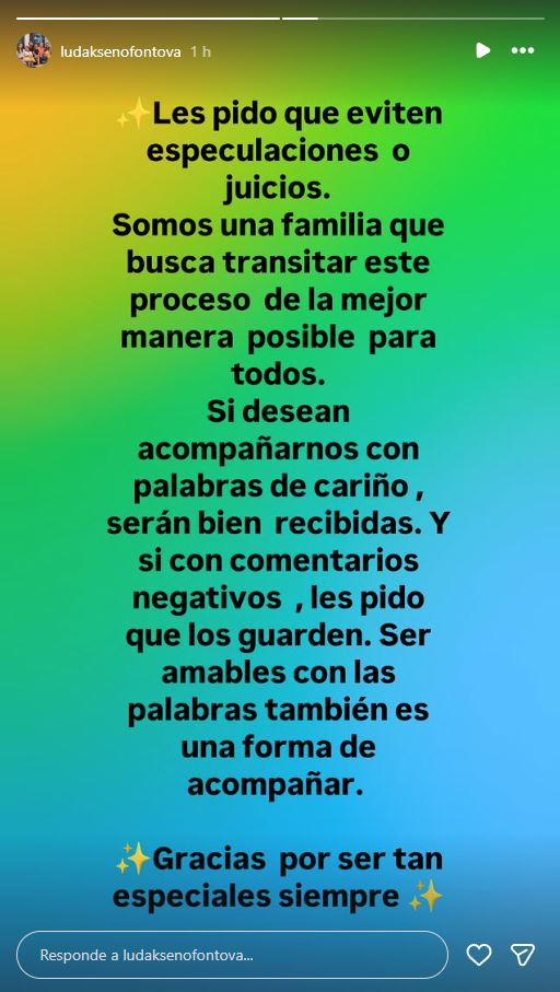 "Si desean acompañarnos con palabras de cariño, serán bien recibidas. Y si es con comentarios negativos, les pido que los guarden. Ser amables con las palabras también es una forma de acompañar. Gracias por ser tan especiales siempre", concluyó.