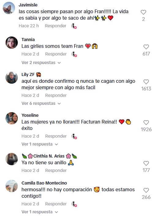 "Las girlies somos team Fran"; "Las mujeres ya no lloran, facturan, reina"; "¡Hermosa! No hay comparación, todas estamos contigo"; "Las cosas siempre pasan por algo, Fran. La vida es sabia y por algo te sacó de ahí", fueron algunos de los comentarios que recibió.