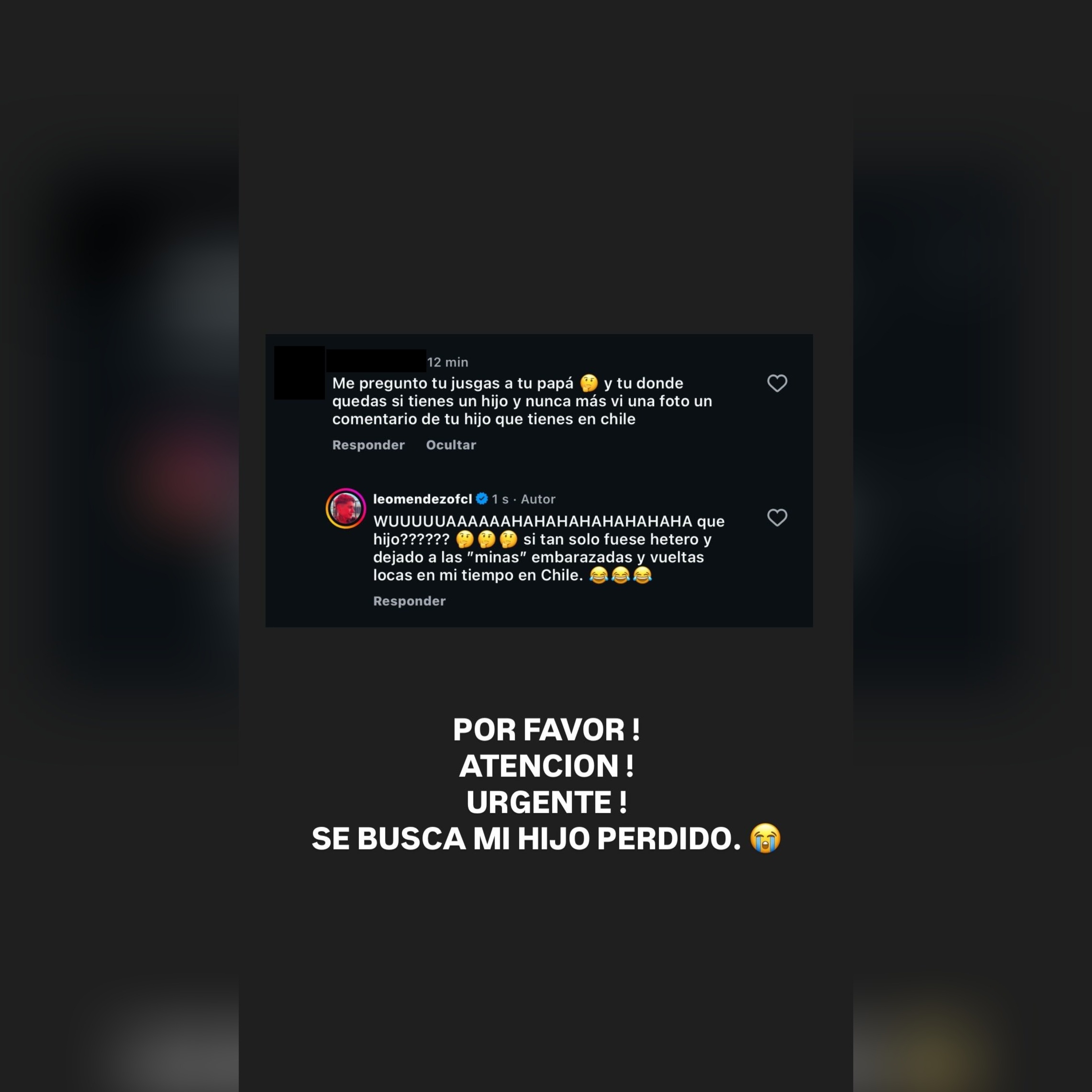 Entre risas, y en tono irónico, contestó en sus historias: "¿Qué hijo? Si tan solo fuese hétero y dejado a las 'minas' embarazadas y vueltas locas en mi tiempo en Chile…". Además, escribió: "¡Atención! ¡Urgente! Se busca a mi hijo perdido".