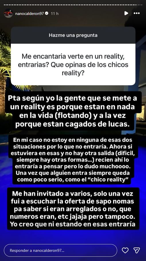 Durante una dinámica de preguntas y respuestas que abrió en su Instagram, "Nano" Calderón entregó su tajante opinión sobre los reality shows y la gente que participa en ellos, así como también si es que entraría a uno.