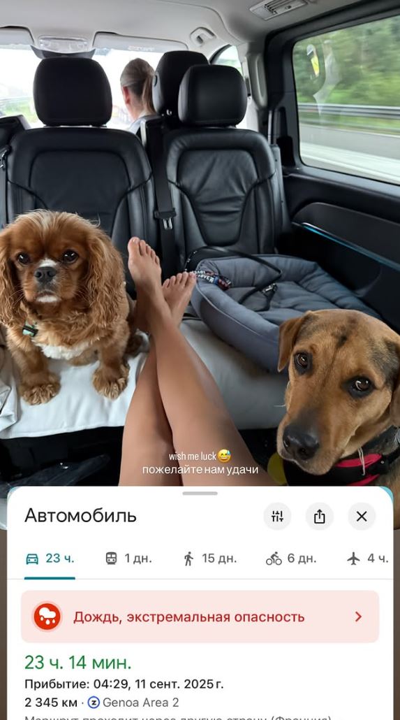 Lo anterior porque en horas de la mañana de este miércoles 10 de septiembre, la joven publicó una enigmática historia a su cuenta de Instagram en la que aparece a bordo de lo que sería una van, en los asientos de los pasajeros, acompañados de dos perritos.