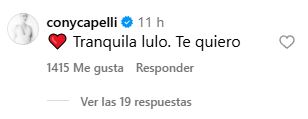 La bailarina dejó en claro que entre ambas sigue habiendo una fraterna amistad. "Tranquila lulo. Te quiero", le comentó Capelli a la influencer, dejándole también un emoji de un corazón.