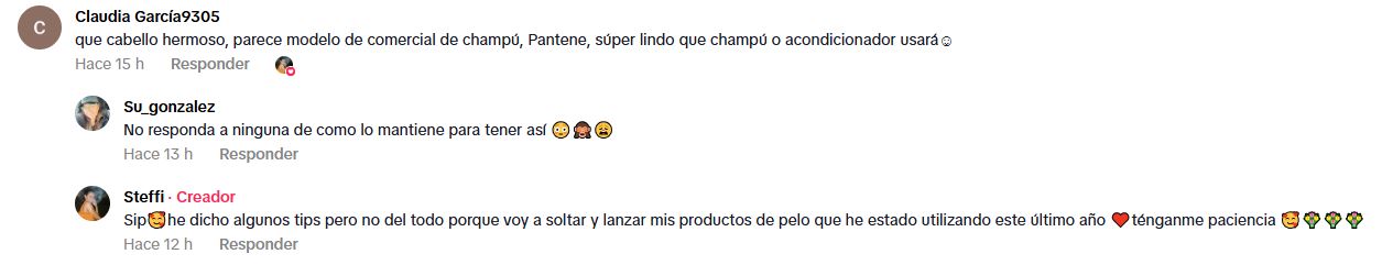 Steffi Méndez respondió la pregunta de su seguidora y detalló cuál será su nuevo emprendimiento. "Sip, he dicho algunos tips, pero no del todo, porque voy a soltar y lanzar mis productos de pelo que he estado utilizando este último año. Ténganme paciencia", respondió la influencer.
