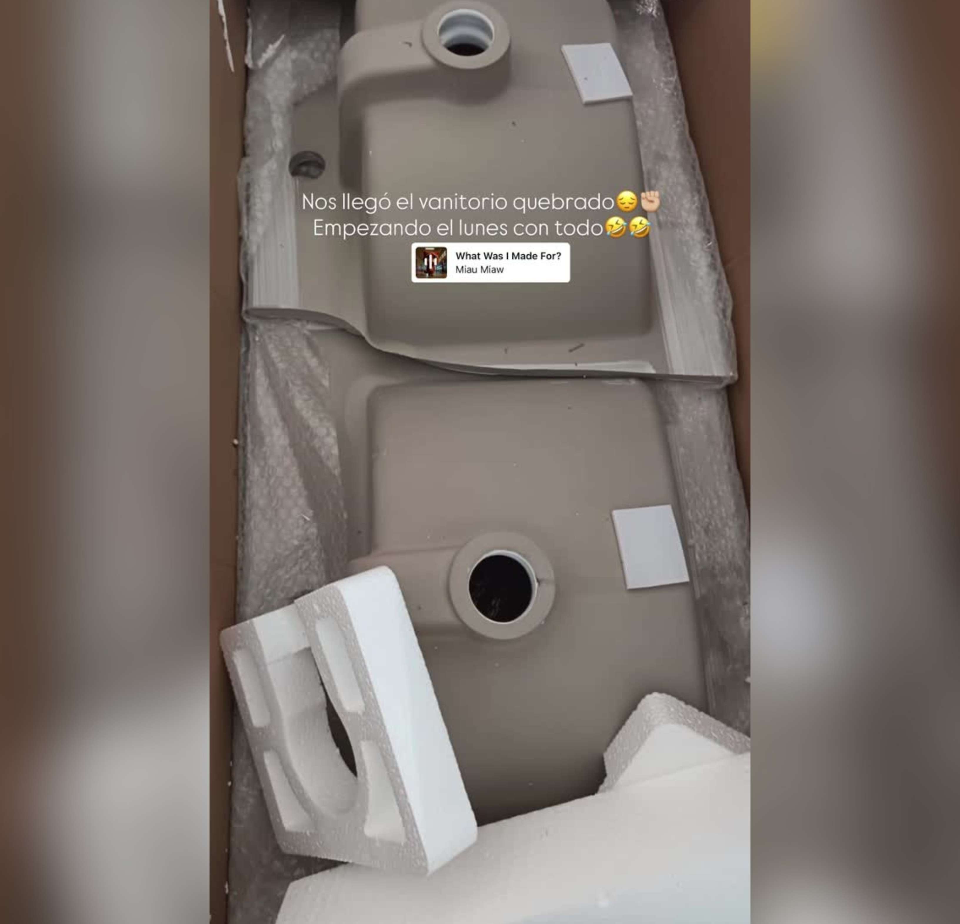 "Nos llegó el vanitorio quebrado. Empezando el lunes con todo", escribió en la publicación. La imagen muestra que el mueble, un vanitorio doble, estaba partido por la mitad, pese a venir protegido con plumavit y plástico de burbujas.