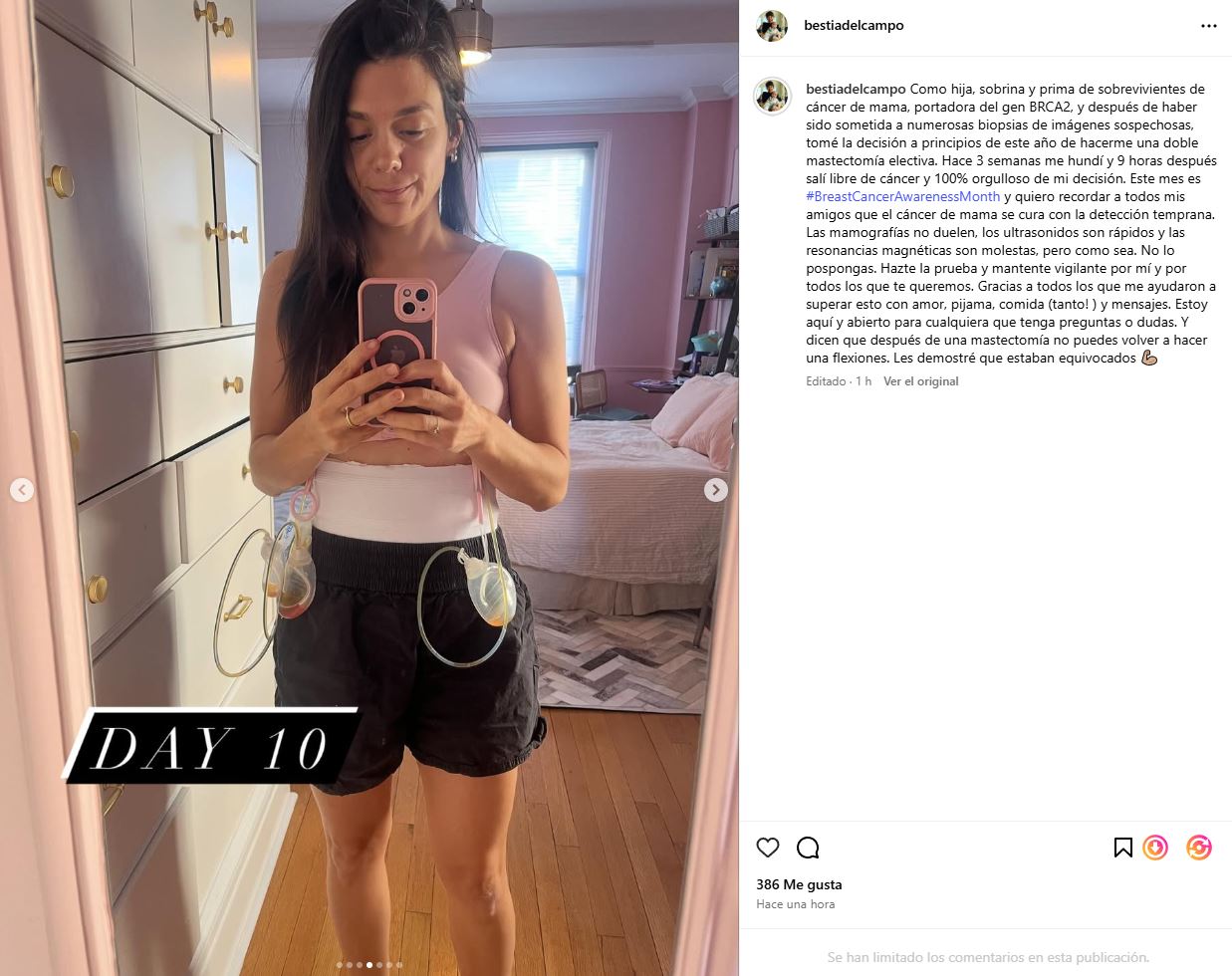 Ir a la siguiente nota"Como hija, sobrina y prima de sobrevivientes de cáncer de mama, portadora del gen BRCA2, y después de haber sido sometida a numerosas biopsias de imágenes sospechosas, tomé la decisión a principios de este año de hacerme una doble mastectomía electiva. Hace 3 semanas me hundí y 9 horas después salí libre de cáncer y 100% orgullosa de mi decisión", sentenció.