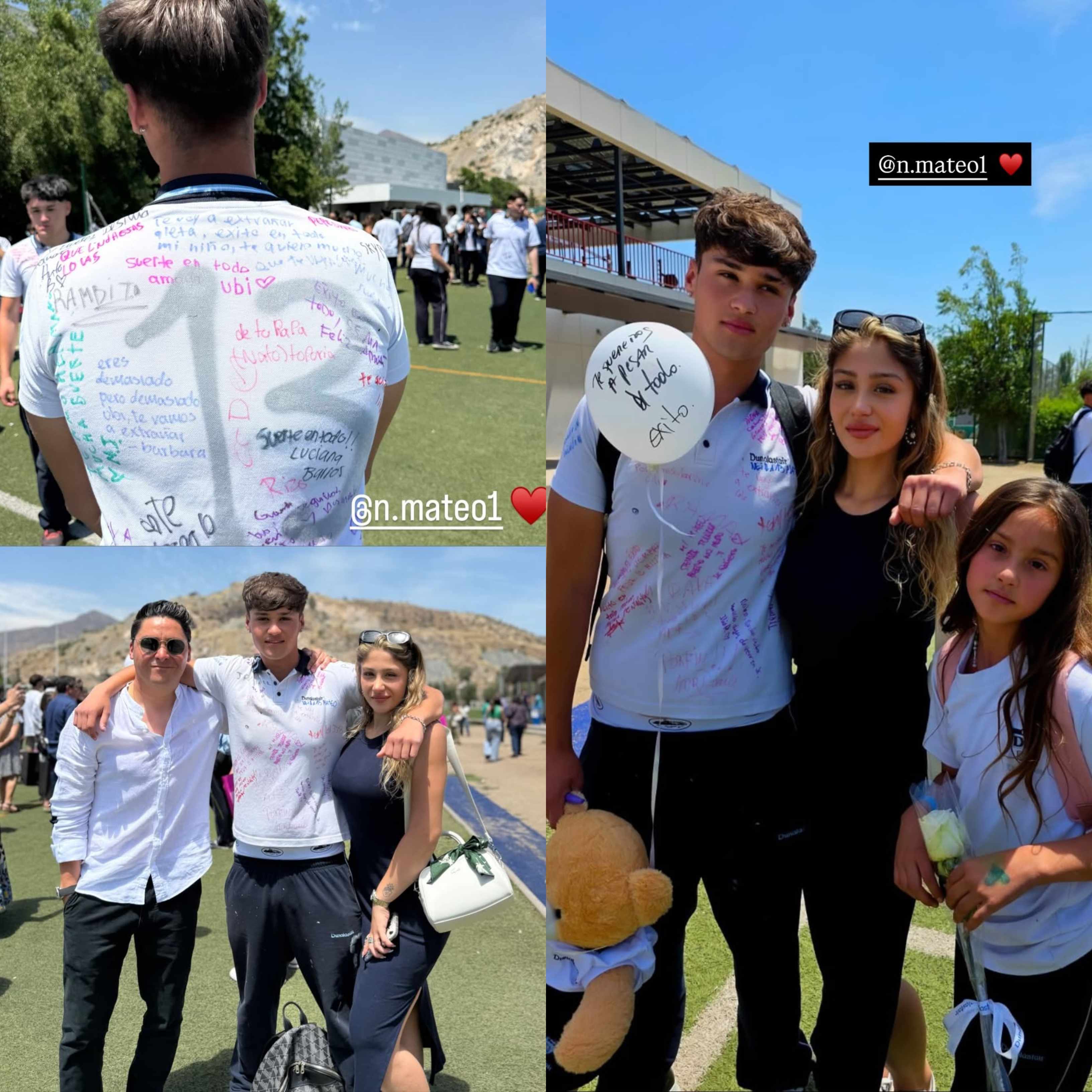 A través de redes sociales, ambos compartieron imágenes de la ceremonia, en la que también participaron las hermanas de Mateo, Trinidad y Pascuala. El joven de 18 años posó con su uniforme, cubierto de dedicatorias de sus compañeros, siguiendo la tradicional costumbre de los estudiantes al terminar el colegio.