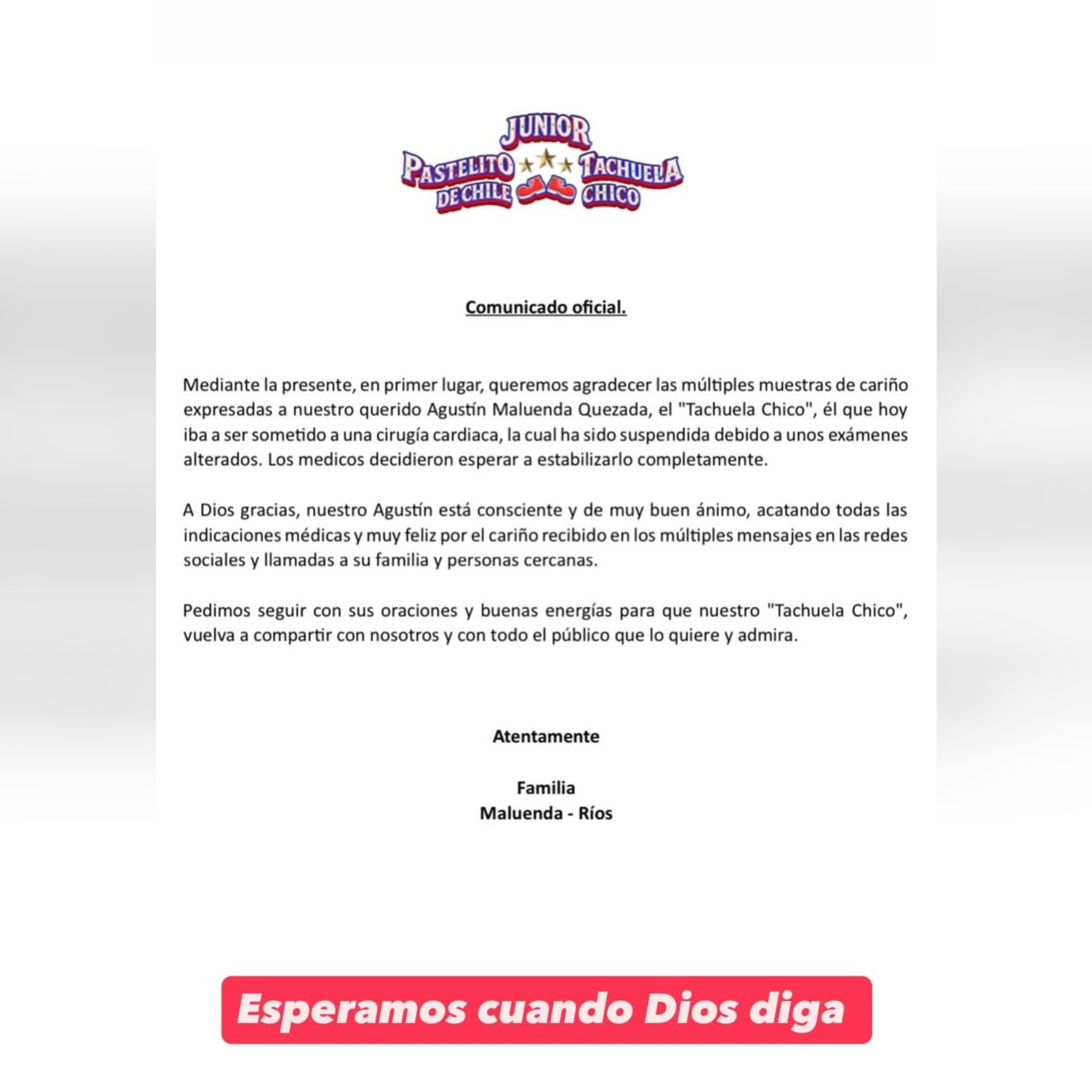Finalmente, la familia hizo un llamado a mantener las oraciones y las buenas energías, confiando en una pronta recuperación del artista: "Para que nuestro Tachuela Chico vuelva a compartir con nosotros y con todo el público que lo quiere y admira".