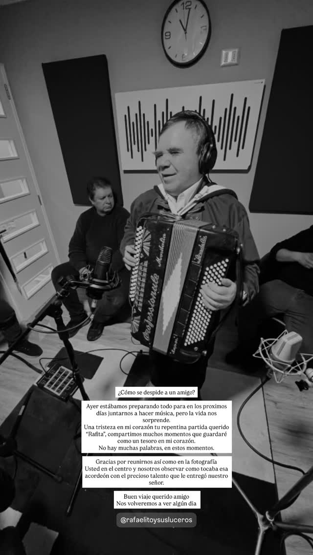 "Ayer estábamos preparando todo para en los próximos días juntarnos a hacer música, pero la vida nos sorprendió. Una tristeza en mi corazón, tu repentina partida, querido 'Rafita', compartimos muchos momentos que guardaré como un tesoro en mi corazón", escribió.
