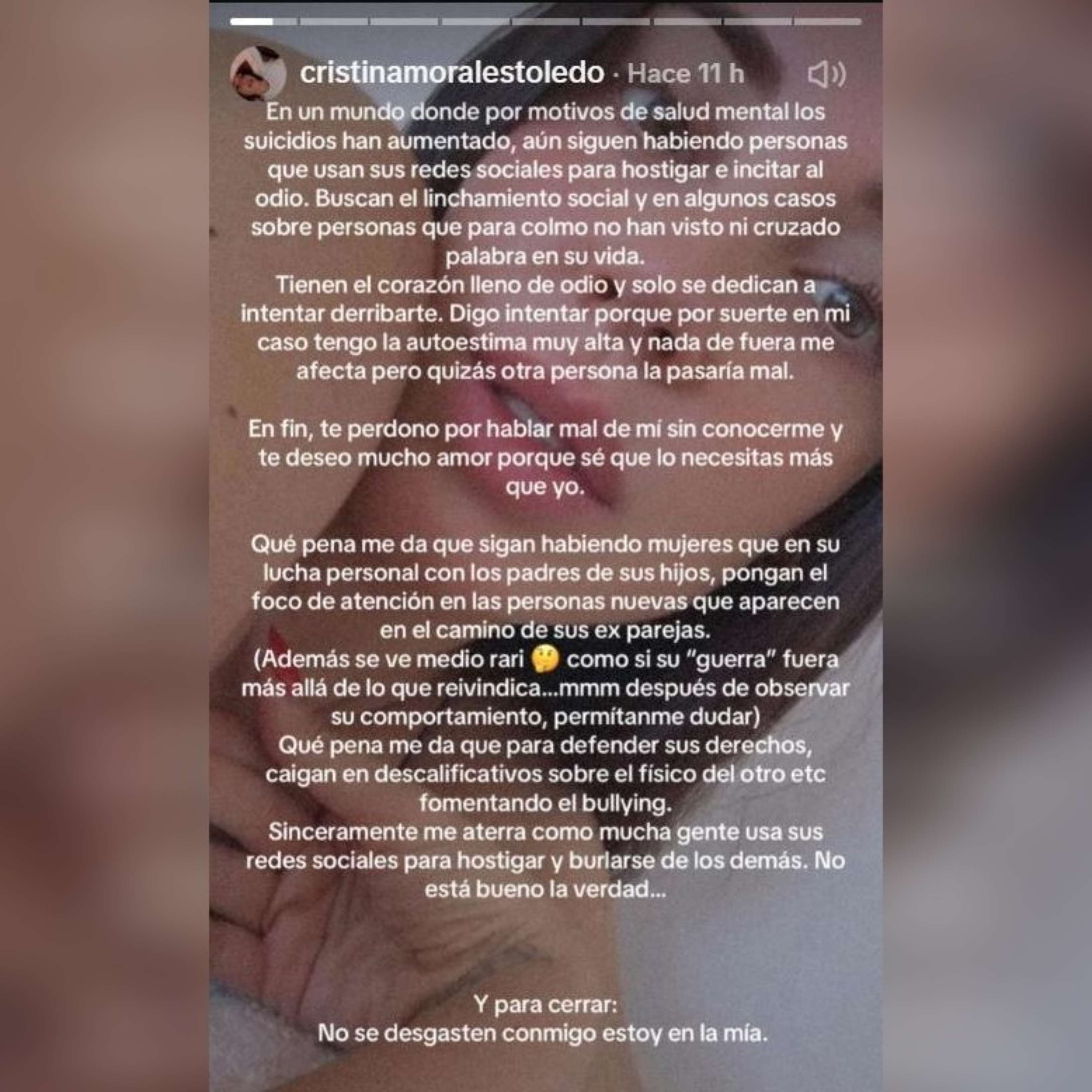 Pero no se quedó ahí. En el mismo mensaje, Morales apuntó directamente al trasfondo del conflicto y lanzó una crítica hacia ciertas actitudes. "Qué pena me da que sigan habiendo mujeres que, en su lucha personal con los padres de sus hijos, pongan el foco de atención en las personas nuevas que aparecen en el camino de sus exparejas", manifestó.