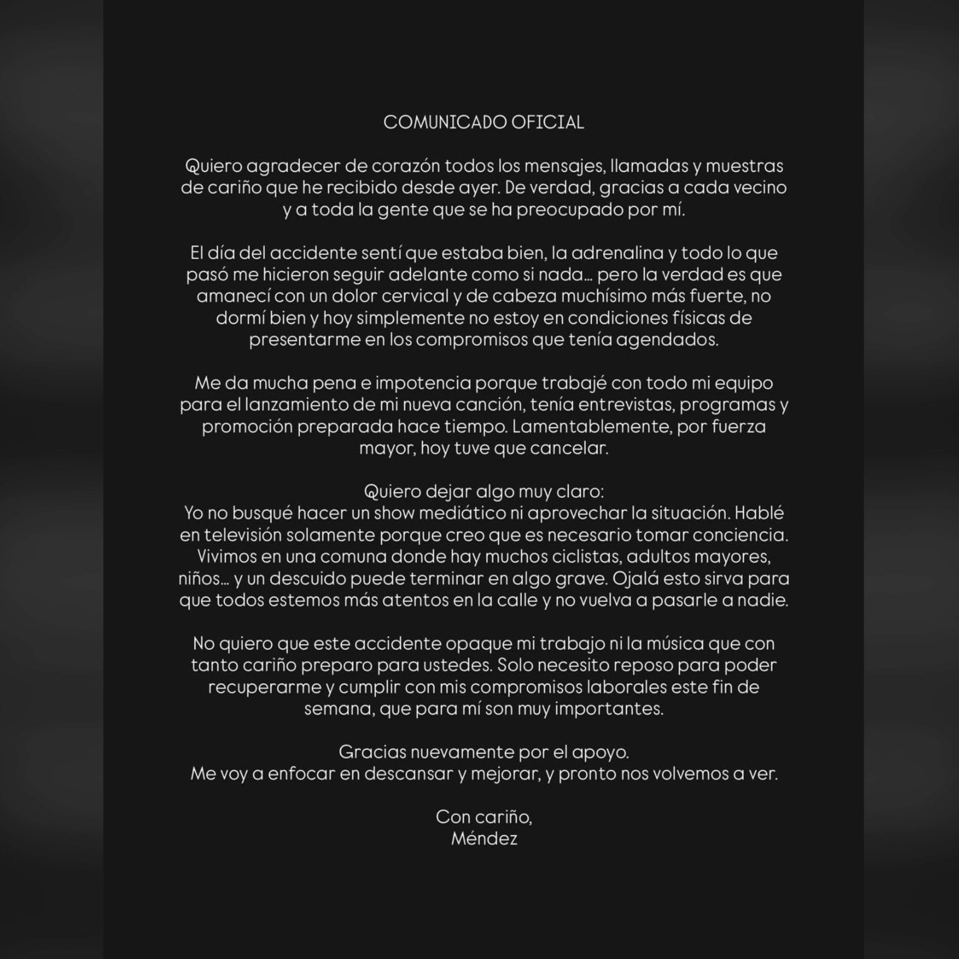 Finalmente, remarcó que "no quiero que este accidente apague mi trabajo ni la música que con tanto cariño preparo para ustedes. Solo necesito reposo para poder recuperarme".
