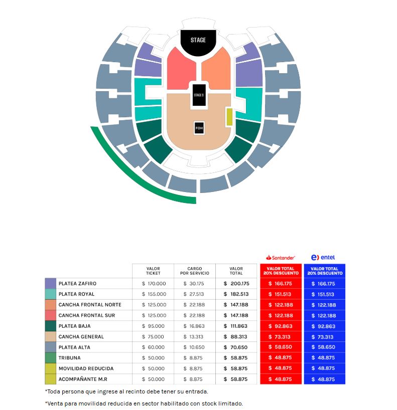 En cuanto a los precios, estos parten desde los $58.875, a los $200.175, incluyendo el cargo por servicio. No obstante, los clientes Santander y Entel, quienes tienen acceso a la preventa, pueden comprar los boletos con un 20% de descuento.