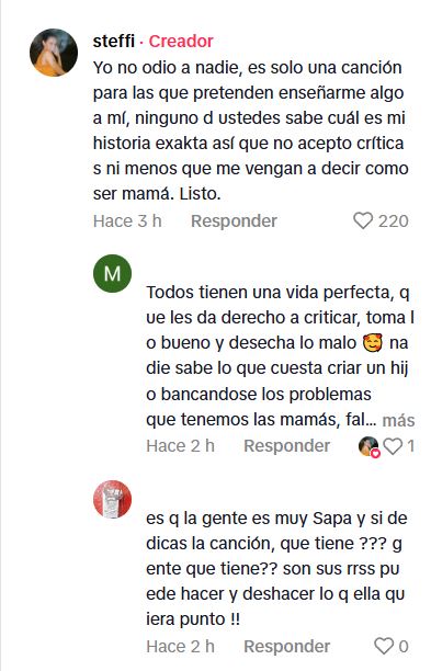 "Yo no odio a nadie, es solo una canción para las que pretenden enseñarme algo a mí, ninguno de ustedes sabe cuál es mi historia exacta, así que no acepto críticas ni menos que me vengan a decir como ser mamá. Listo", escribió.