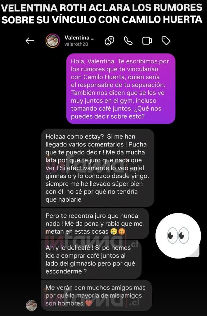 El sitio Infama contactó a Vale Roth para preguntarle de forma explícita por el supuesto vínculo con Huerta, quien se encuentra soltero tras su mediática ruptura con Marité Matus. El rumor tomó fuerza debido a que ambos entrenan en el mismo gimnasio y, según testigos, se les ha visto conversando de manera frecuente.