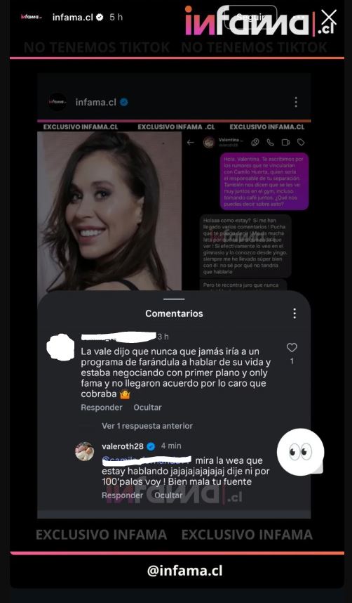 Ante los rumores iniciados en diferentes programas de farándula, Valentina Roth aclaró al medio Infama que no tiene ningún tipo de relación amorosa con Camilo Huerta y que solo los une un vínculo de amistad.