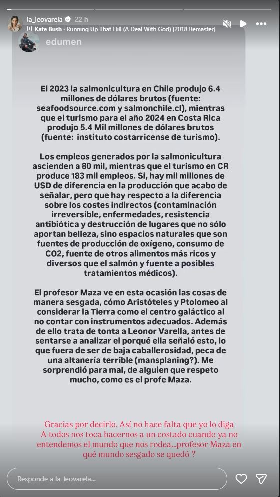Las palabras del reconocido científico llegaron a los oídos de Varela, quien respondió a través de su cuenta de Instagram, compartiendo una reflexión realizada por otra persona que comparaba la industria salmonera con el turismo sostenible en Costa Rica.