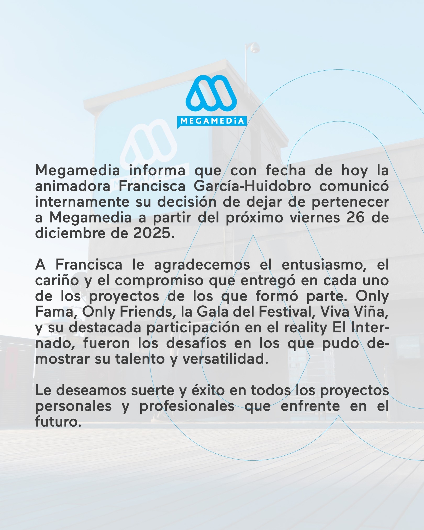Megamedia informa que con fecha de hoy la animadora Francisca García-Huidobro comunicó internamente su decisión de dejar de pertenecer a Megamedia a partir del próximo viernes 26 de diciembre de 2025.