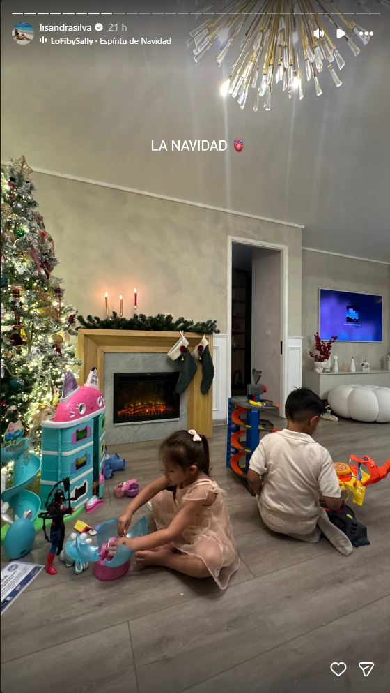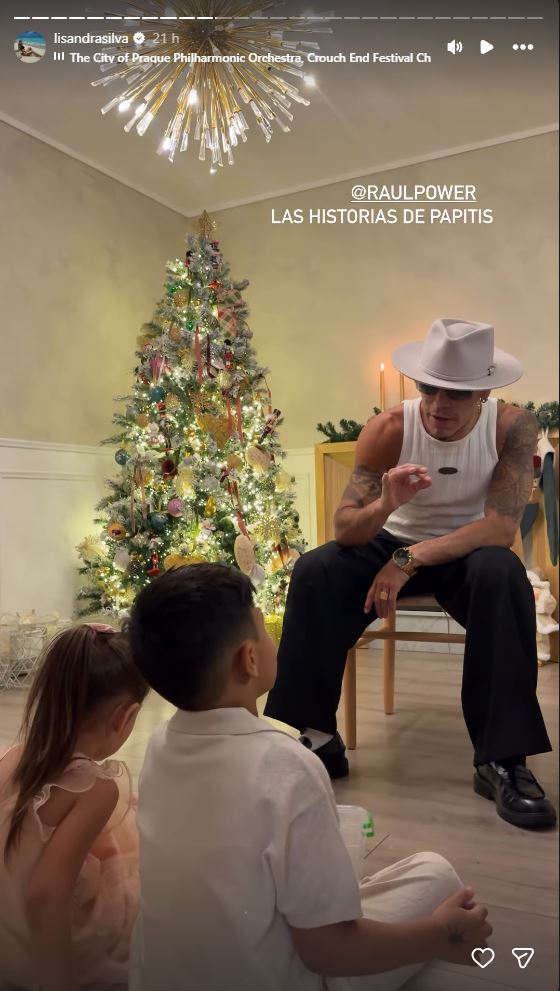 Pero la celebración no terminó ahí. En otras publicaciones, ambos pequeños aparecen felices jugando con sus juguetes, mientras que en otra imagen Raúl Peralta protagoniza un tierno momento: sentado en una silla, les cuenta una historia con música navideña de fondo, mientras sus hijos lo escuchan atentos.