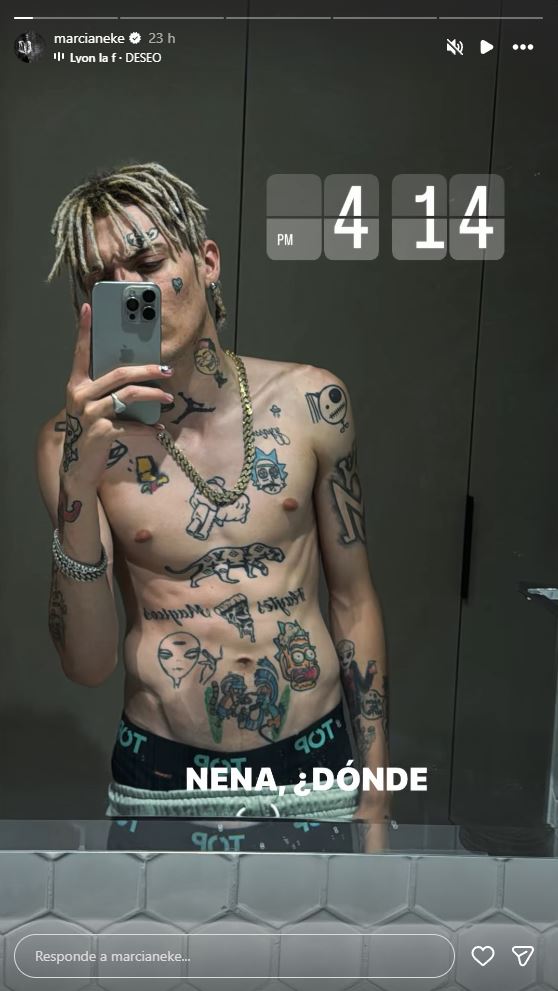 En su cuenta de Instagram, Marcianeke compartió una historia que refleja la nueva faceta física del cantante urbano. El intérprete de “Dímelo Ma” aparece con el torso al descubierto, posando frente al espejo con un cuerpo que luce más definido y tonificado, marcando un evidente cambio respecto a su apariencia anterior.
