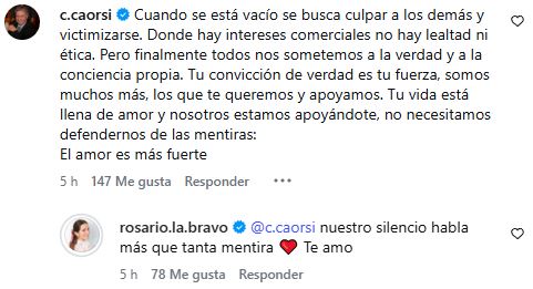 Ir a la siguiente nota"Cuando se está vacío se busca culpar a los demás y victimizarse. Donde hay intereses comerciales, no hay lealtad ni ética. Pero finalmente todos nos sometemos a la verdad y a la conciencia propia. Tu convicción de verdad es tu fuerza, somos muchos más, los que te queremos y apoyamos. Tu vida está llena de amor y nosotros estamos apoyándote, no necesitamos defendernos de las mentiras: El amor es más fuerte", escribió Caorsi.