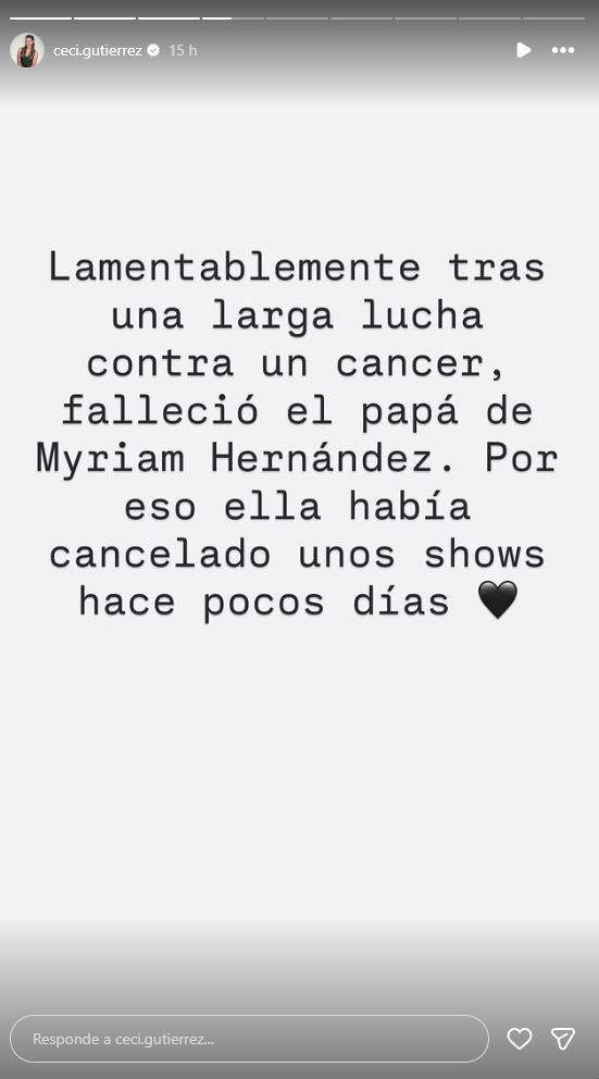 “Lamentablemente, tras una larga lucha contra un cáncer, falleció el papá de Myriam Hernández. Por eso ella había cancelado unos shows hace pocos días”, señaló.