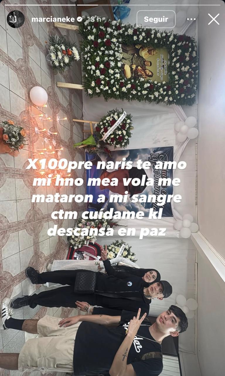 Ir a la siguiente notaEn otra de las fotos aparece junto a dos amigos en el velorio y transparenta que fue asesinado. "x100pre naris te amo mi hno, mea vola me mataron a mi sangre ctm, cuídame descansa en paz", añadió.