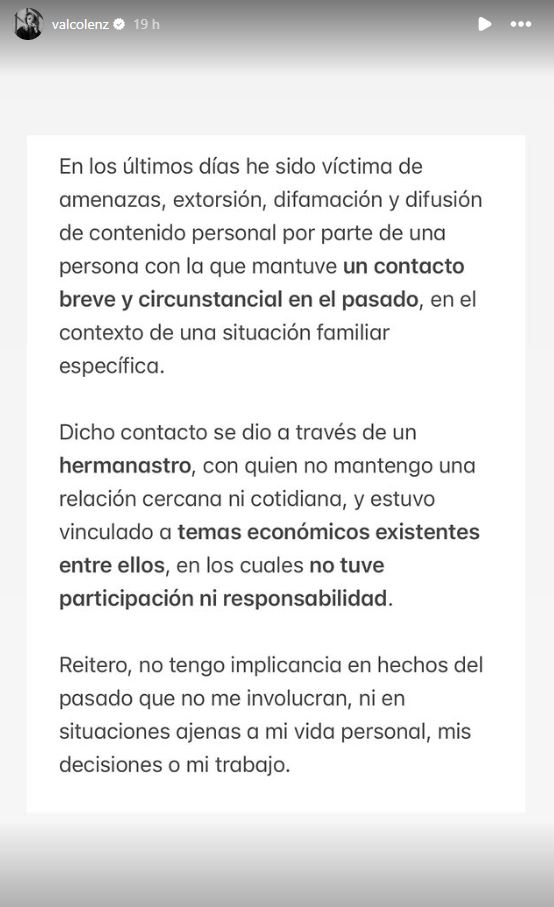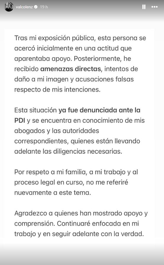 “Esta persona se acercó inicialmente en una actitud que aparentaba apoyo”, lo que posteriormente derivó en “amenazas directas, intentos de daño a mi imagen y acusaciones falsas respecto de mis intenciones”, expresó en su cuenta de Instagram.