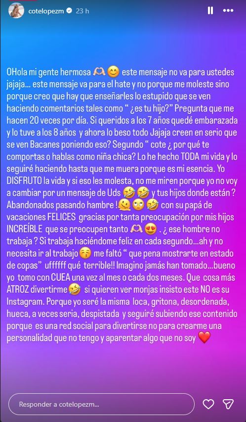 Pese a que López mencionó que el "hate" no le molesta, fue clara en manifestar su pensamiento respecto a quienes opinan constantemente sobre su maternidad o vida amorosa y advirtió a sus seguidores que el mensaje no iba para ellos.