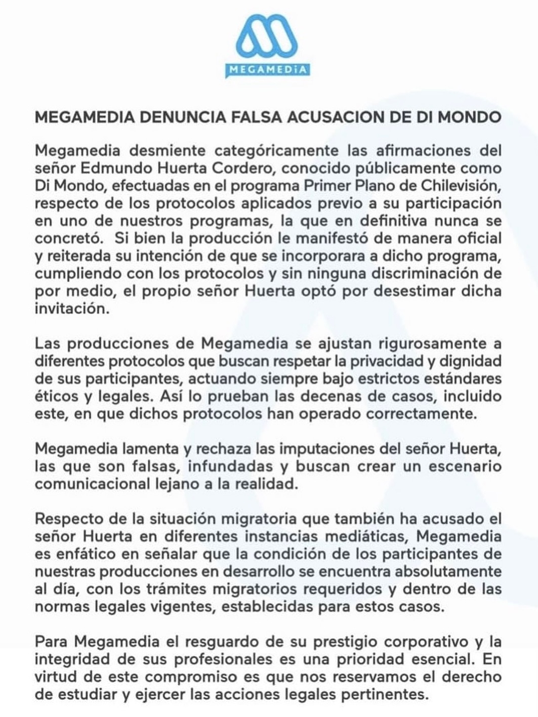 Megamedia desmiente categóricamente las afirmaciones del señor Edmundo Huerta Cordero, conocido públicamente como Di Mondo, efectuadas en el programa Primer Plano de Chilevisión, respecto de los protocolos aplicados previo a su participación en uno de nuestros programas, la que en definitiva nunca se concretó. Si bien la producción le manifestó de manera oficial y reiterada su intención de que se incorporara a dicho programa, cumpliendo con los protocolos y sin ninguna discriminación de por medio, el propio señor Huerta optó por desestimar dicha invitación.