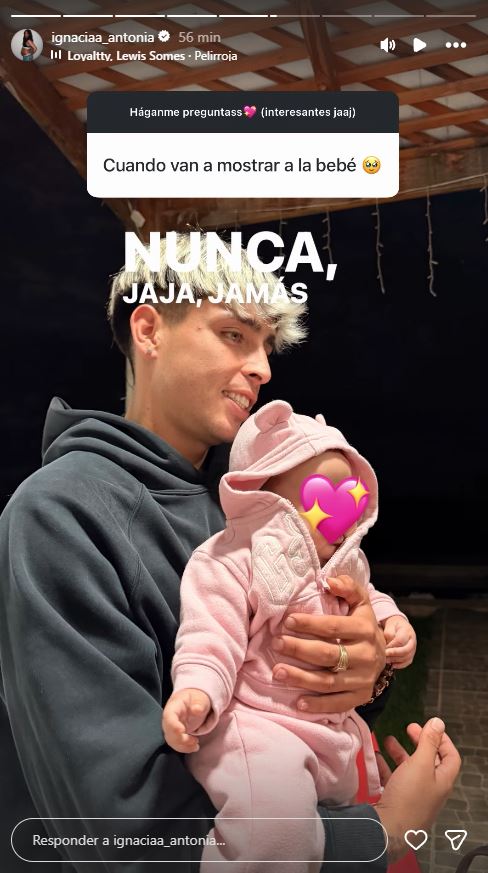 En una reciente dinámica de preguntas, le consultaron por el momento en el que mostraría a su hija y respondió con una foto de su pareja cargando a la niña con la canción "Pelirroja" de Loyaltty y Lewis Somes, sonando de fondo: "Nunca, jamás".