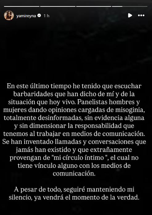La tarde de este viernes, Reyna publicó una historia de Instagram en la que abordó dichos rumores y se dirigió a quienes, según ella, afirman cosas sobre su vida personal sin evidencia alguna.