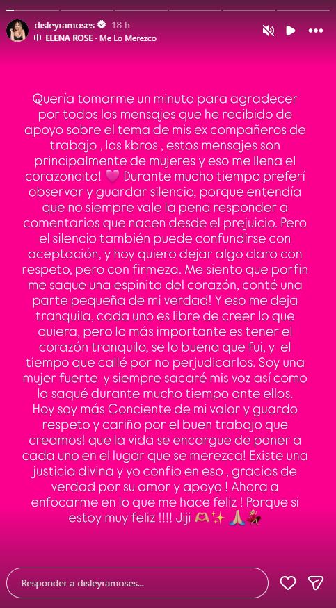 Finalmente, quiso agradecer a quienes le han dejado palabras de apoyo y creen en su versión de los hechos. Dijo que los mensajes vienen principalmente de mujeres y eso la tiene contenta. "Gracias por el apoyo que he recibido sobre el tema de mis excompañeros de trabajo, me llena el corazoncito... Ahora a enfocarme en lo que me hace feliz", concluyó.