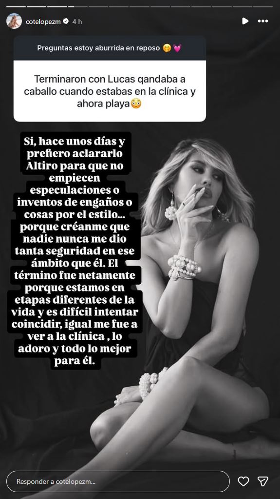A través de redes sociales y en medio de su reposo médico, la también influencer realizó una dinámica de preguntas y respuestas para interactuar con sus seguidores, instancia en la que fue consultada por su relación con Lucas Lama.