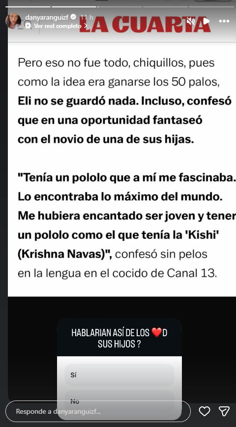 En ese contexto, Eli de Caso rompió el silencio para defenderse y dejó claro que no iba a permitir que se hablara así de ella y su familia. "Tú (Daniela Aránguiz) le faltas el respeto a mis hijos al decir algo así. Yo soy una mamá tremendamente respetuosa por mis tres hijos. Nunca he hecho eso y nunca lo haré. Jamás en la vida me metería con la pareja de una hija" expresó tajantemente.